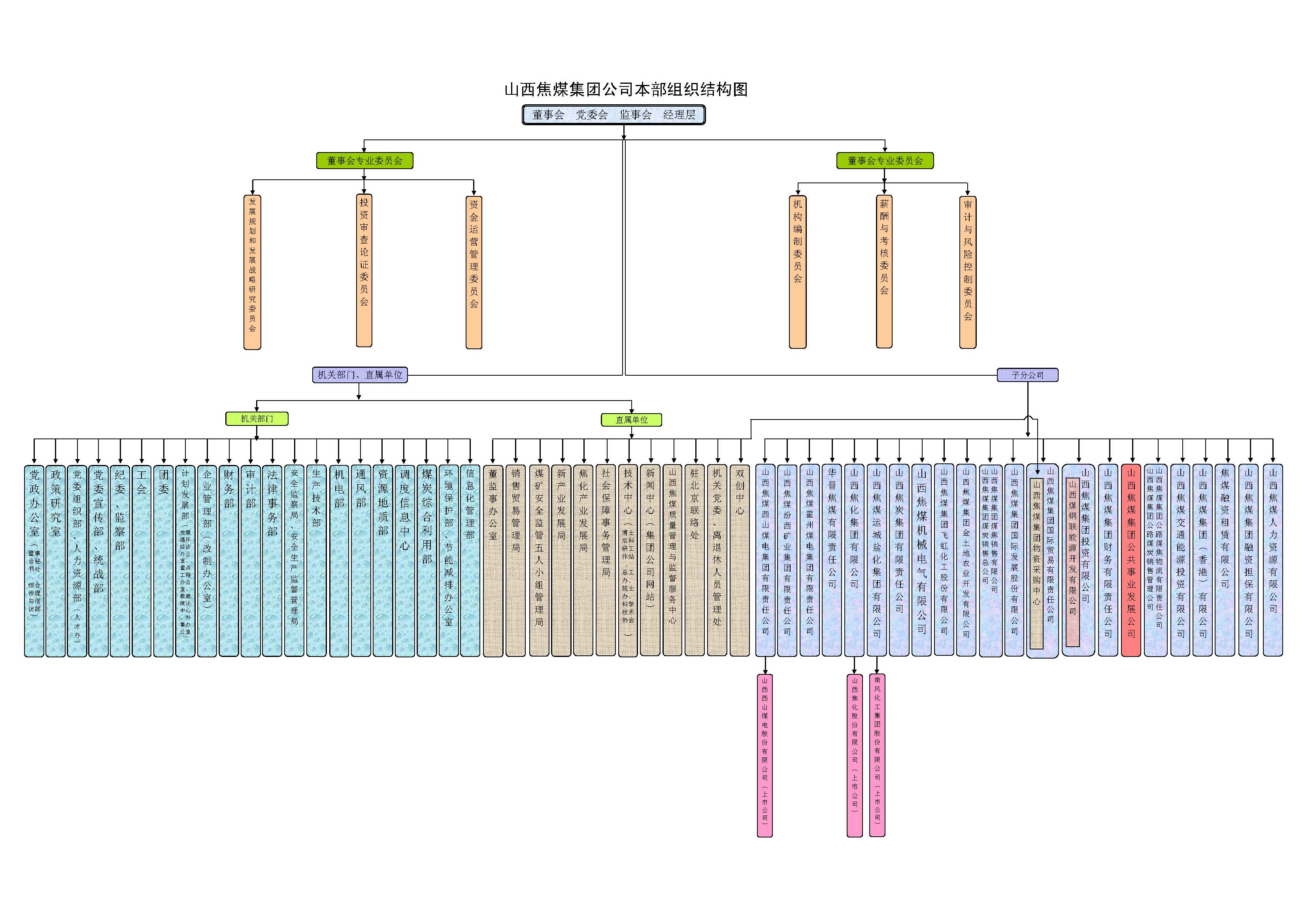 山(shan)西(xi)焦(jiao)(jiao)煤組建于2001年10月(yue),屬山(shan)西(xi)省(sheng)國有獨資(zi)(zi)企業,總部位于山(shan)西(xi)省(sheng)會太原市(shi),下有西(xi)山(shan)煤電(dian)(dian)、汾西(xi)礦業、 霍州煤電(dian)(dian)、華晉焦(jiao)(jiao)煤、山(shan)西(xi)焦(jiao)(jiao)化(hua)(hua)、運(yun)城(cheng)鹽(yan)化(hua)(hua)、山(shan)西(xi)焦(jiao)(jiao)炭、機械(xie)電(dian)(dian)氣公(gong)(gong)(gong)司(si)(si)、飛虹化(hua)(hua)工、金土地(di)公(gong)(gong)(gong)司(si)(si)、銷售總公(gong)(gong)(gong)司(si)(si)、國際(ji)發展公(gong)(gong)(gong)司(si)(si)、國際(ji)貿(mao)易公(gong)(gong)(gong) 司(si)(si)、投資(zi)(zi)公(gong)(gong)(gong)司(si)(si)、財務公(gong)(gong)(gong)司(si)(si)、公(gong)(gong)(gong)共(gong)事業公(gong)(gong)(gong)司(si)(si)、公(gong)(gong)(gong)路物流公(gong)(gong)(gong)司(si)(si)、交通能投公(gong)(gong)(gong)司(si)(si)、香(xiang)港(gang)公(gong)(gong)(gong)司(si)(si)、融資(zi)(zi)租賃公(gong)(gong)(gong)司(si)(si)、融資(zi)(zi)擔保公(gong)(gong)(gong)司(si)(si)等22個子分(fen)公(gong)(gong)(gong)司(si)(si)和西(xi)山(shan) 煤電(dian)(dian)股(gu)(gu)(gu)份公(gong)(gong)(gong)司(si)(si)、山(shan)西(xi)焦(jiao)(jiao)化(hua)(hua)股(gu)(gu)(gu)份公(gong)(gong)(gong)司(si)(si)、南風化(hua)(hua)工股(gu)(gu)(gu)份公(gong)(gong)(gong)司(si)(si)3個A股(gu)(gu)(gu)上(shang)市(shi)公(gong)(gong)(gong)司(si)(si)。